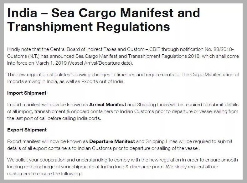 The Central Board of Indirect Taxes and Customs-CBIT has announced Sea Cargo Manifest and Transshipment Regulations 2018,which shall come into force on March 1,2019(Vessel Arrival/Departure Date).